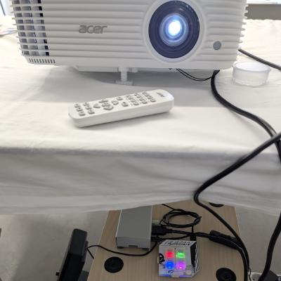 Turn a Raspberry Pi into a lightweight projector player with Debian aarch64, looping video/audio, and a DEFCON 29 badge as a glowing red shutdown button.